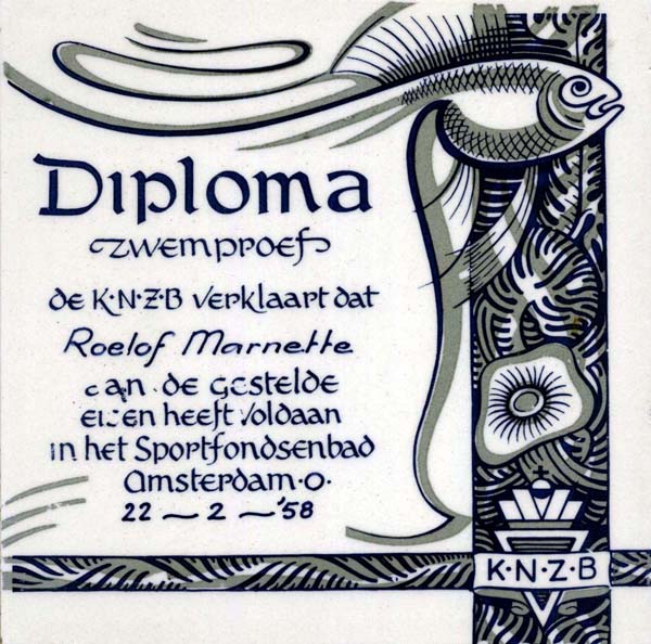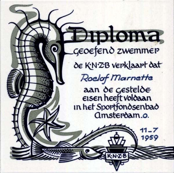 Twee tegels ter herinnering aan het behalen van dezwemdiploma's "zwemproef" (diploma A) en "Geoefend zwemmer" (diploma B)