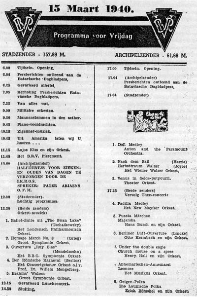 In Nederlands Indië wilde men ook zelf een omroeporganisatie oprichten. Ook hier wilde men beslist geen verzuiling en geen politieke of religieuze propaganda op de radio. De overheid wilde, net als trouwens met de pers in het algemeen het geval was, een dikke vinger in de pap houden. Toch kwam er in de voorwaarden voor de op te richten omroepmaatschappij geen verbod op deze propaganda voor. Men had hiervoor een andere oplossing bedacht: de zender moest datgene uitzenden wat het volk wenste, en WAT het volk wenste, dat bepaalde de Directeur van Waterstaat.